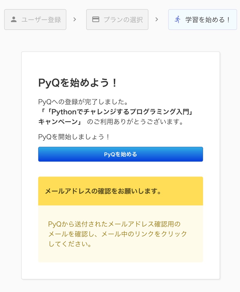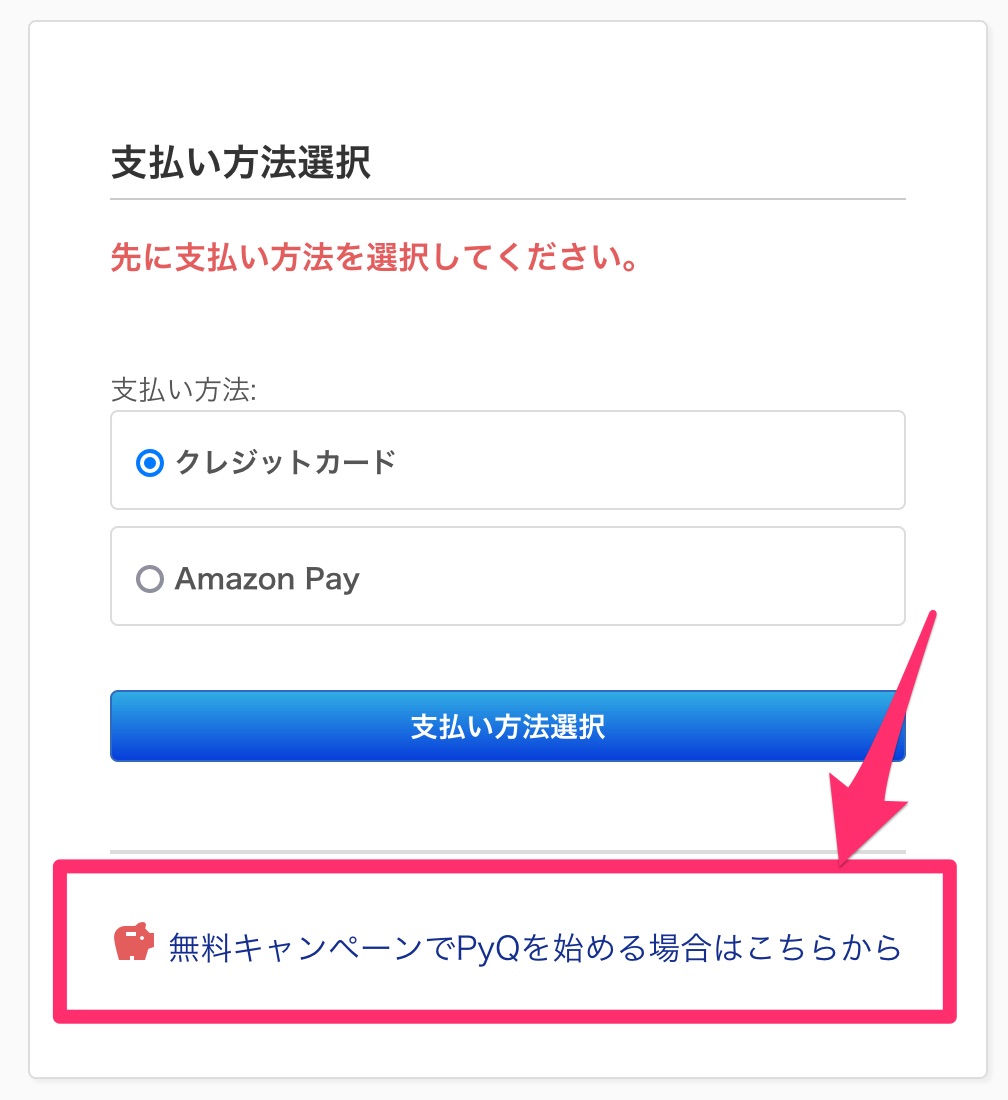 画面下部の「無料キャンペーンでPyQを始める場合はこちらから」のリンクをクリックします。