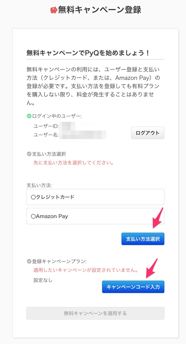 無料キャンペーン登録画面で、支払い方法の登録と、キャンペーンコードの入力を行います。