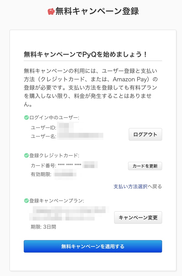 https://pyq.jp/account/settings/billing/ にアクセスし、「キャンペーンコードを適用して無料キャンペーンをはじめる」リンクをクリックします。