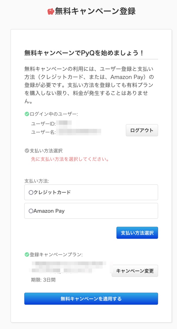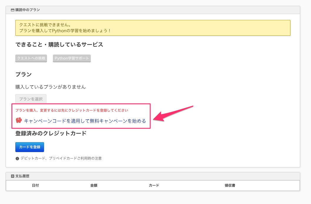 PyQにアカウントをお持ちの方も、有料プランを購読中でなければ、キャンペーンコードを利用できます。