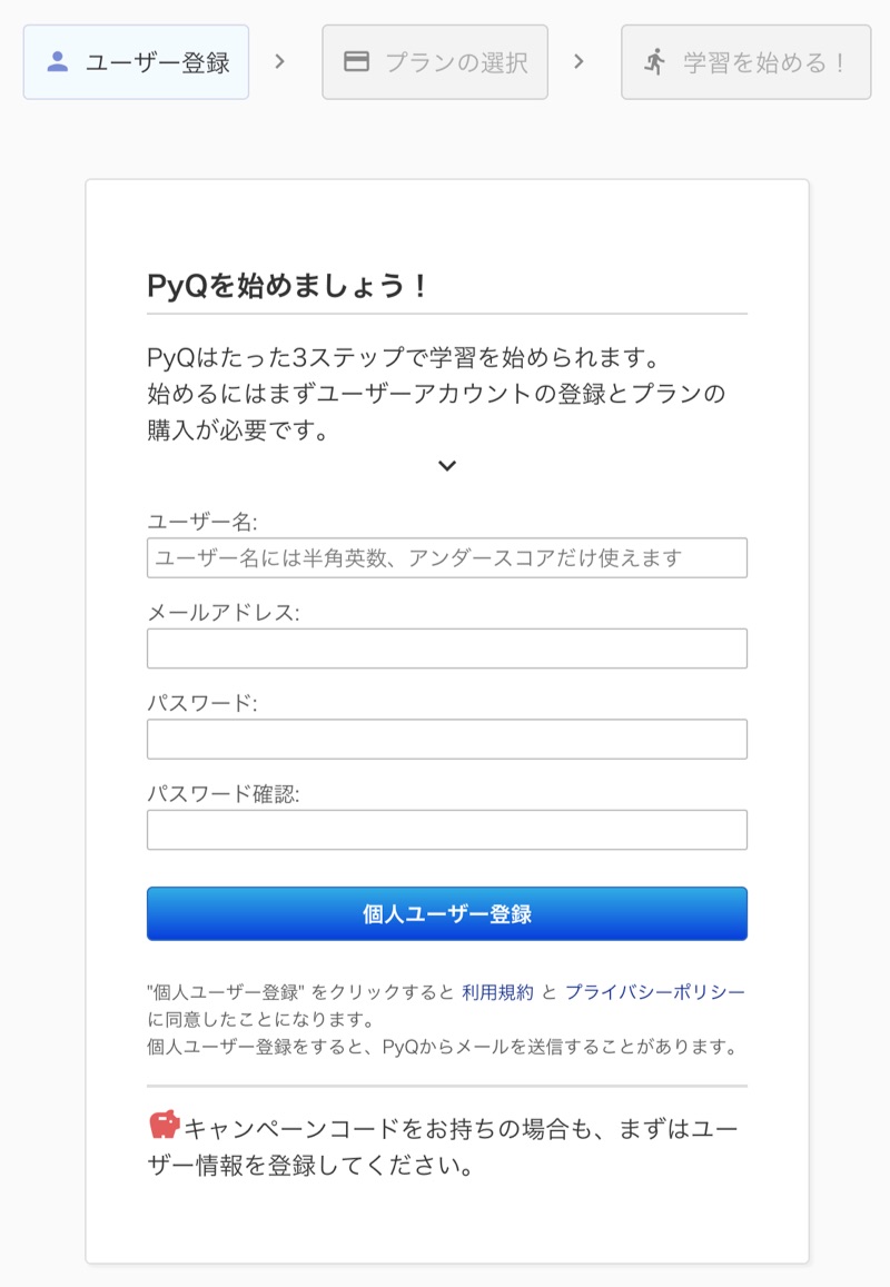 PyQにアカウントがないユーザーはユーザー登録を行う必要があります。